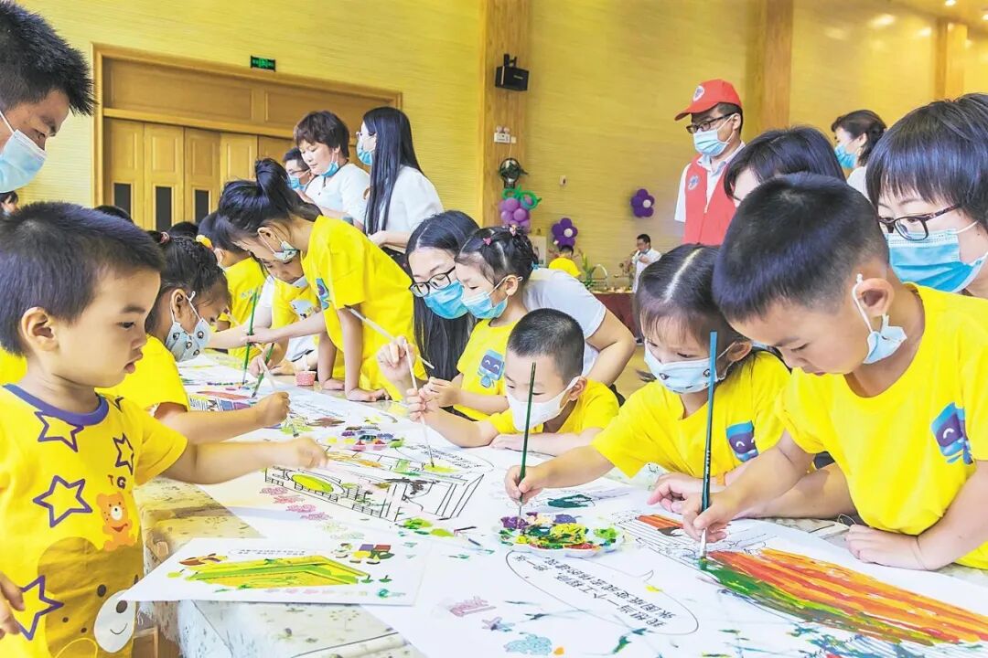 2020年6月9日,20余名火神山、雷神山“两山”医院建设者的孩子们,在武汉花山生态城作画,画出父母建设的项目工程。(湖北日报全媒记者 梅涛 通讯员 潘海亮 摄)
