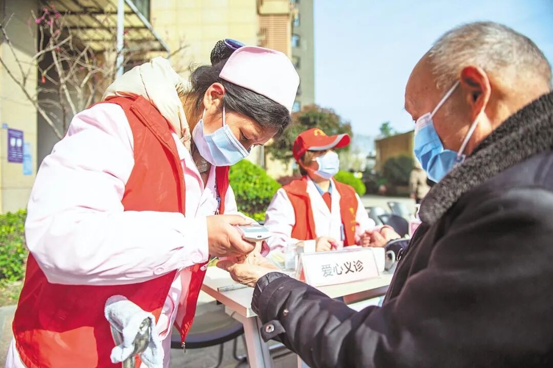 3月4日,武汉市青山区红钢城街道二街社区,志愿者在为居民测血脂。(湖北日报全媒记者 何宇欣 通讯员 陈立峰 摄)