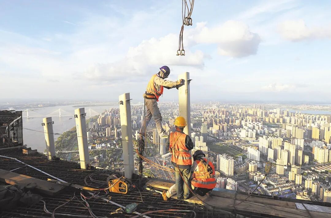 2020年8月6日,建筑工人在武汉绿地中心楼顶施工。(湖北日报全媒记者 柯皓 摄)