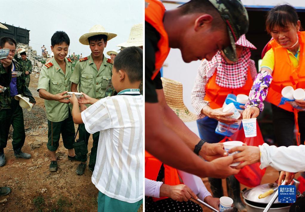 这是一张拼版照片,左图为:在江西永修,学生为护堤抢险的武警官兵送水(新华社记者宋振平摄于1998年7月28日);右图为:在江西鄱阳江家岭村,村民为前来抗洪抢险的武警官兵盛绿豆汤(新华社记者周密摄于2020年7月11日)。新华社发