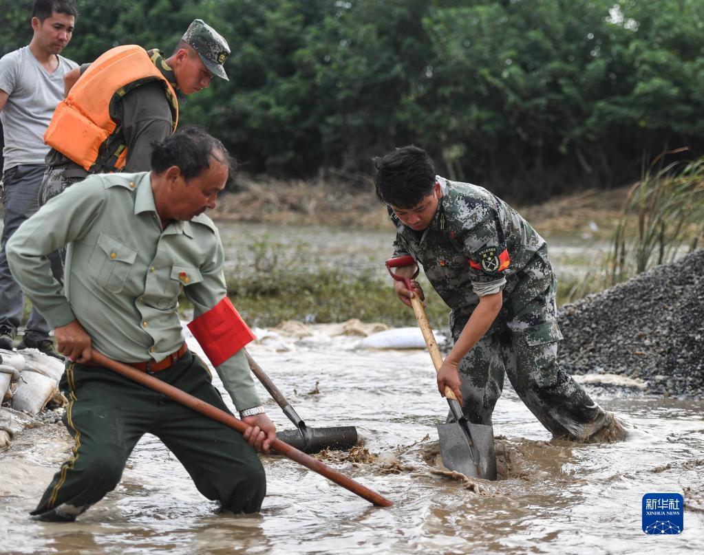 第71集团军某旅官兵在江西九江彭泽县芙蓉墩镇沿江大道东埂封堵管涌(2020年7月13日摄)。新华社发(方知 摄)