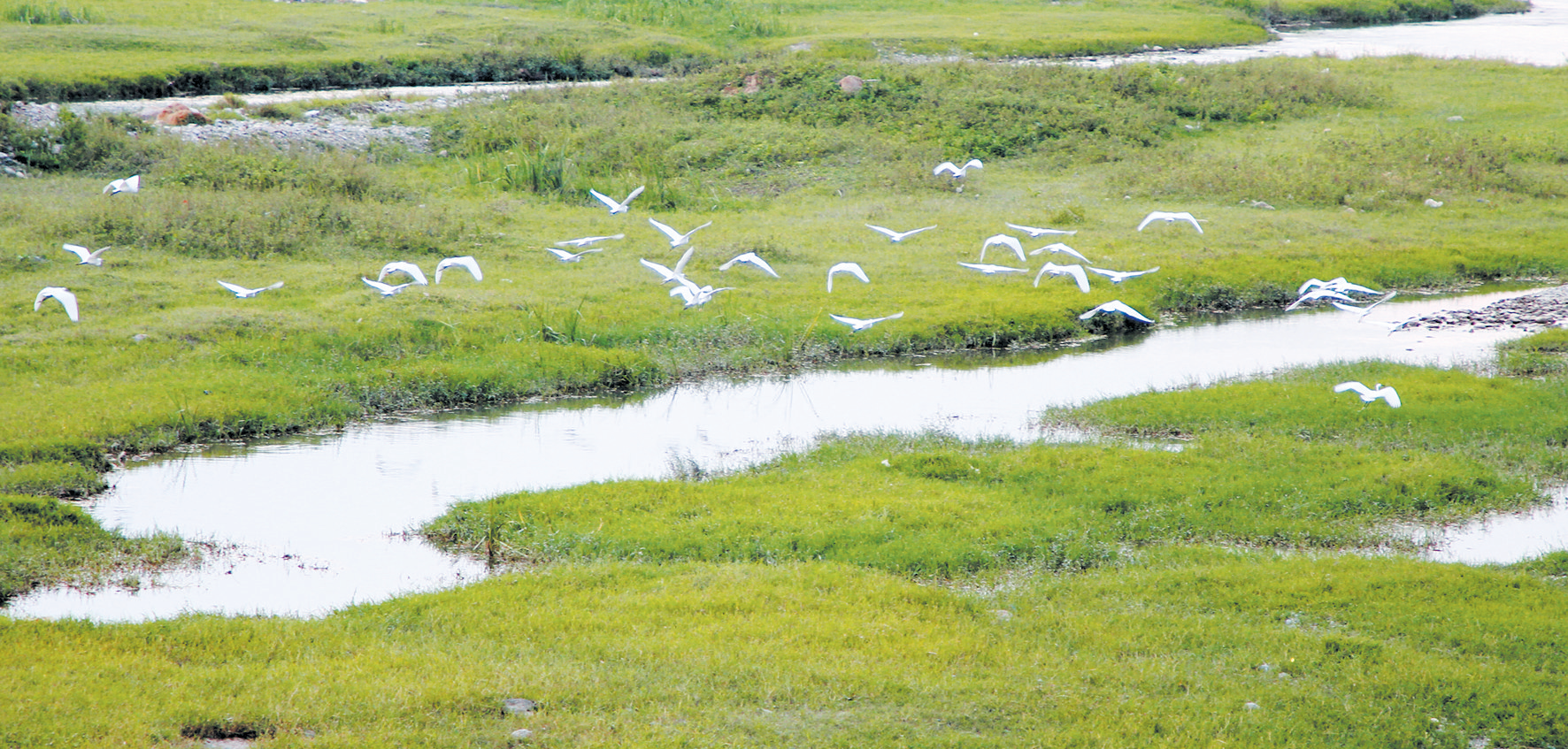 9月23日,一群白鹭在房县马栏河红塔段湿地上翩翩起舞。近年来,通过大治理、大保护,马栏河生态环境持续改善,吸引野鸭、白鹭等在沿线湿地安家。特约记者张启龙 通讯员 刘凤 摄