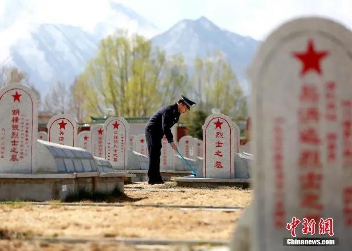 资料图:民警为无名烈士清扫墓碑。何宇恒 摄