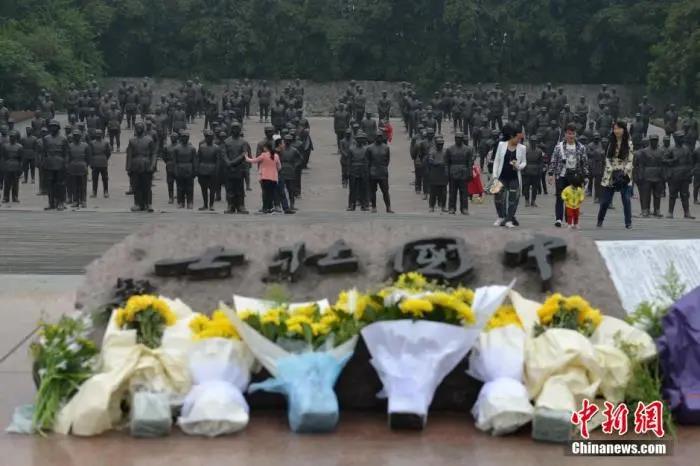 资料图:成都建川博物馆壮士群雕广场前摆满鲜花。中新社记者 张浪 摄
