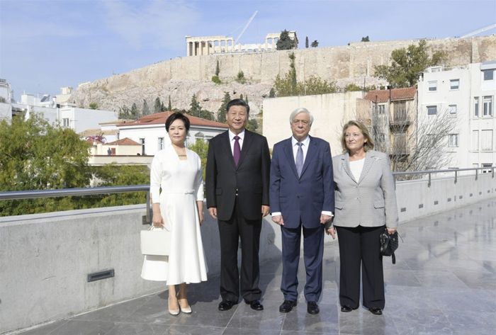 2019年11月12日,习近平总书记和夫人彭丽媛在时任希腊总统帕夫洛普洛斯夫妇陪同下,参观雅典卫城博物馆。