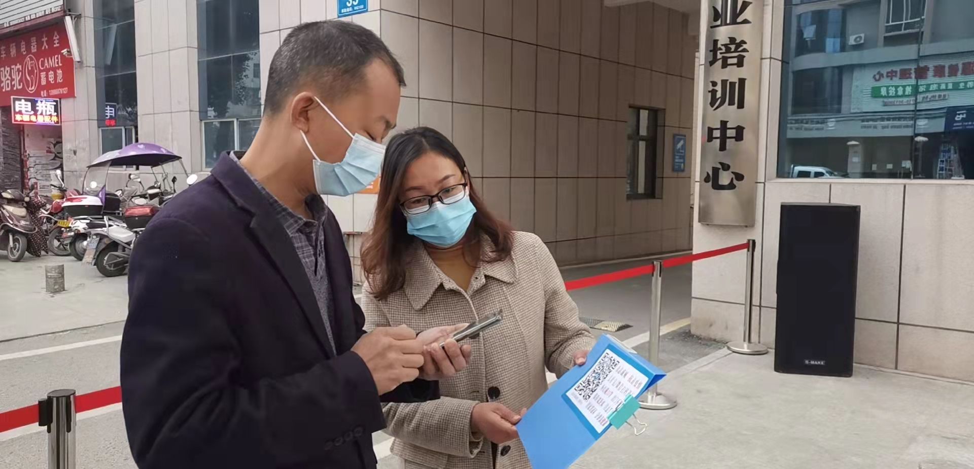 房县人才超市、人力资源市场、零工驿站现场。前来咨询和应聘群众和学员自觉配合健康码登记。
