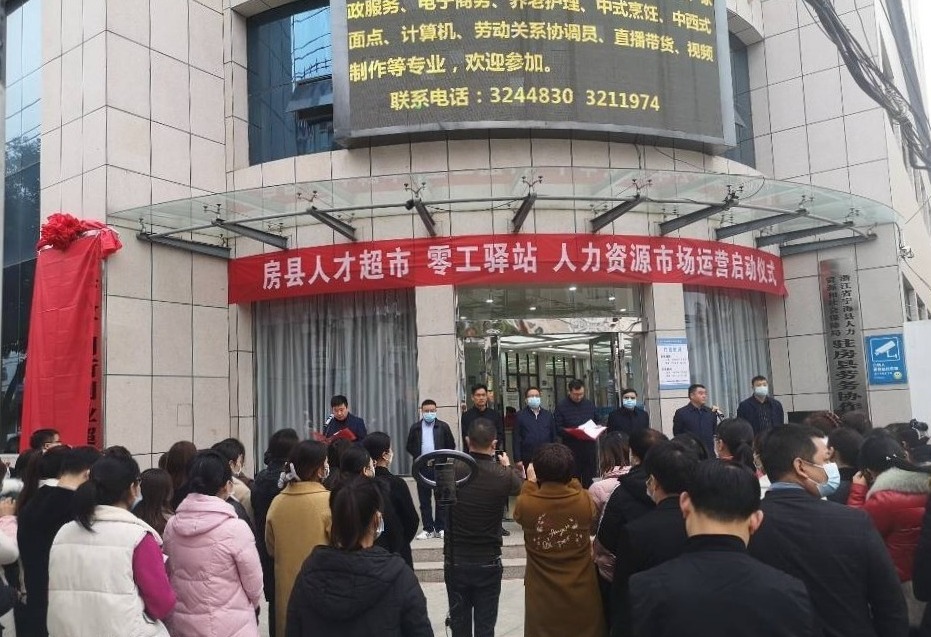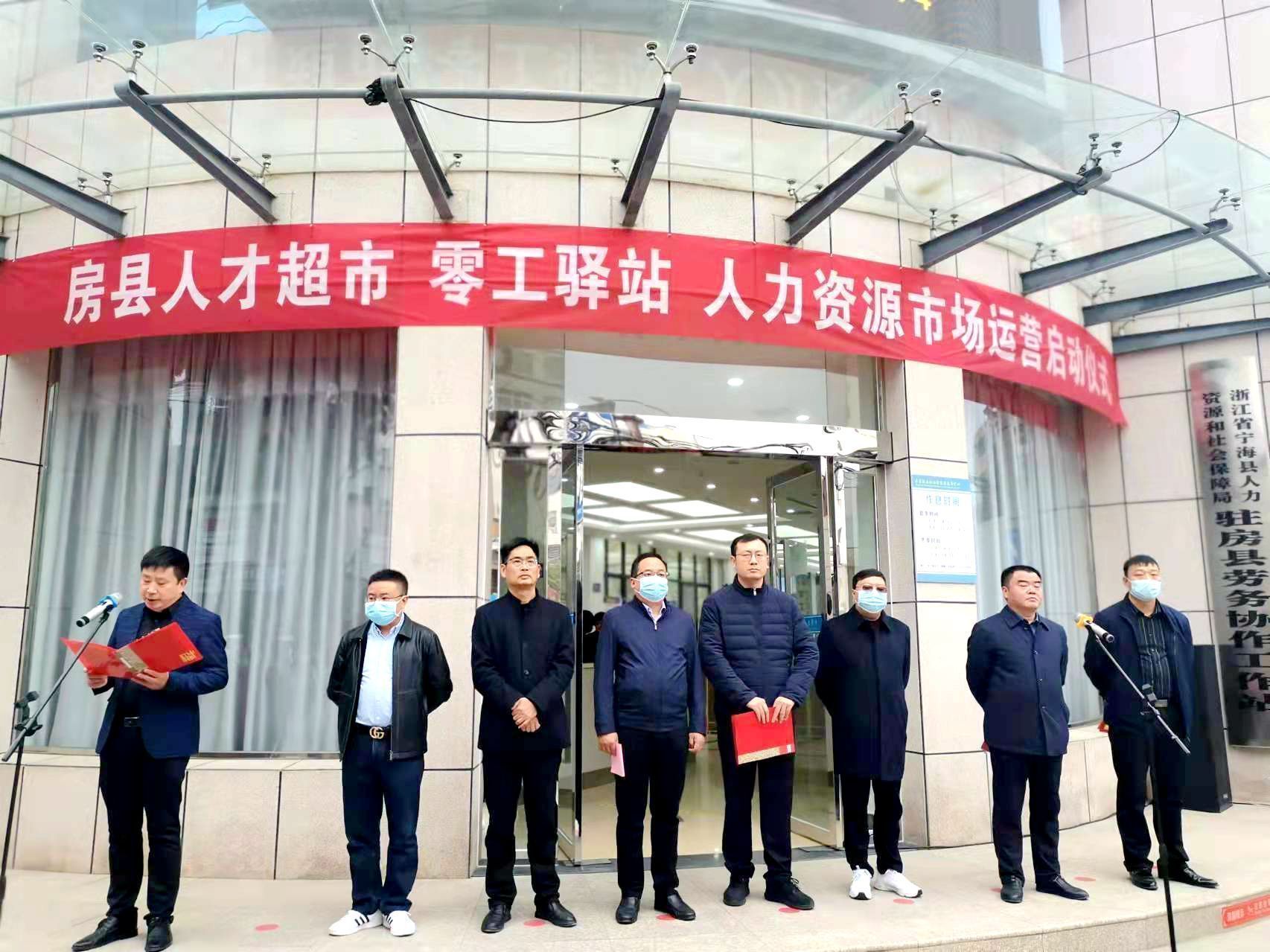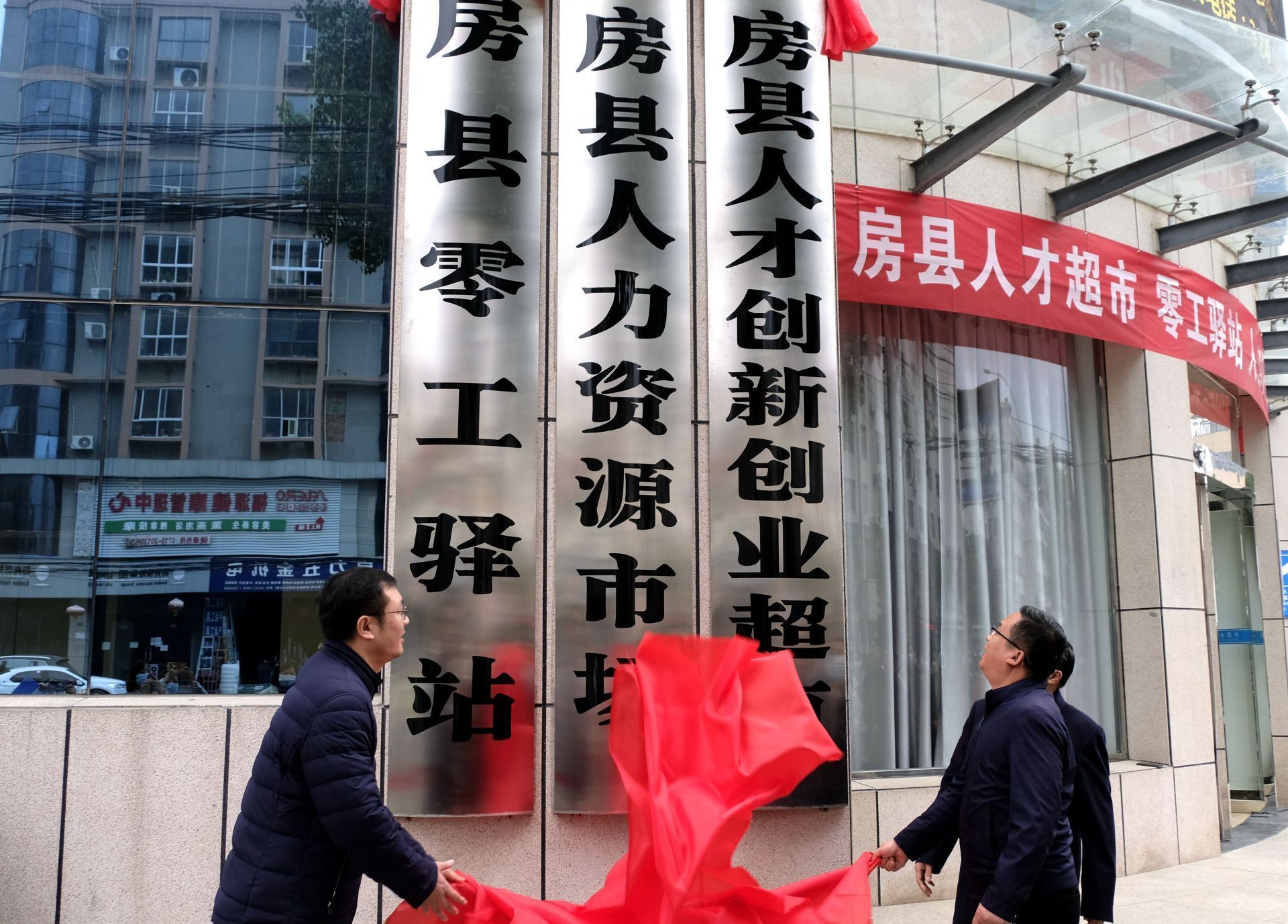 县委常委、组织部长王斌,县委常委、副县长黄克伟共同为房县人才超市、人力资源市场、零工驿站运营启动揭牌。