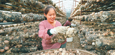 图为11月22日,房县红塔镇油坪村村民在采收小花菇。张启龙 摄(影像中国)