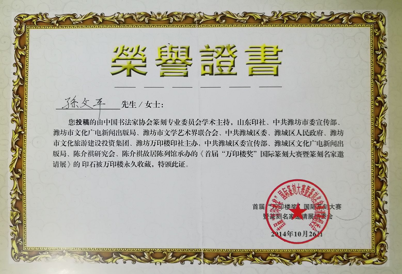 此次国际篆刻活动由中国书法家协会篆刻委员会、中国艺术研究院中国篆刻院、西泠印社、山东印社等权威组织专家组成评审委员会进行评选,共评出海内外投稿作者的440件篆刻作品入“万印楼”永久收藏陈列。其中中国大陆408件(13名湖北艺术家入藏者中十堰仅孙文平一人),中国香港3件,日本29件。