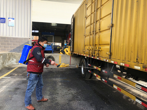 园区内,一名工作人员正在对运送快递的车辆进行全面消杀,在快递分拣车间,佩戴着口罩和手套的工作人员正对已经过喷雾机消毒的快递进行分拣。