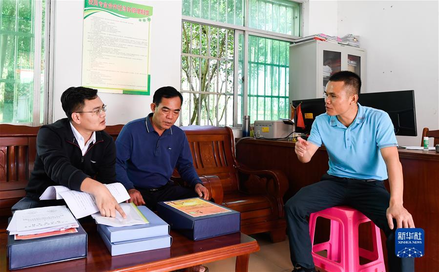 2021年11月13日,在海南省琼中黎族苗族自治县湾岭镇加章村委会,纪检监察干部(左一)在查阅乡村振兴及村级财务支出相关材料。新华社记者 杨冠宇 摄