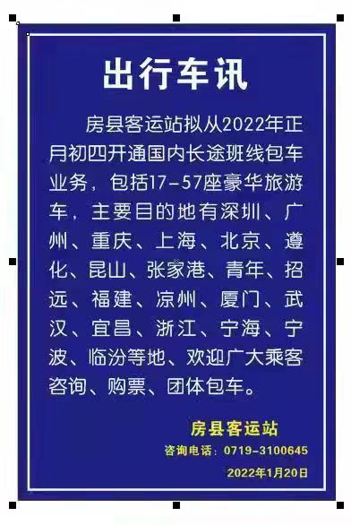 房县客运站拟从2022年正月初四开通国内长途班线包车业务,包括17-57座豪华旅游车,主要目的地有深圳、广州、重庆、上海、北京、遵化、昆山、张家港、青岛、招远、福建、凉州、厦门、武汉、宜昌、浙江、宁海、宁波、临汾等地,欢迎广大乘客咨询、购票、团体包车。