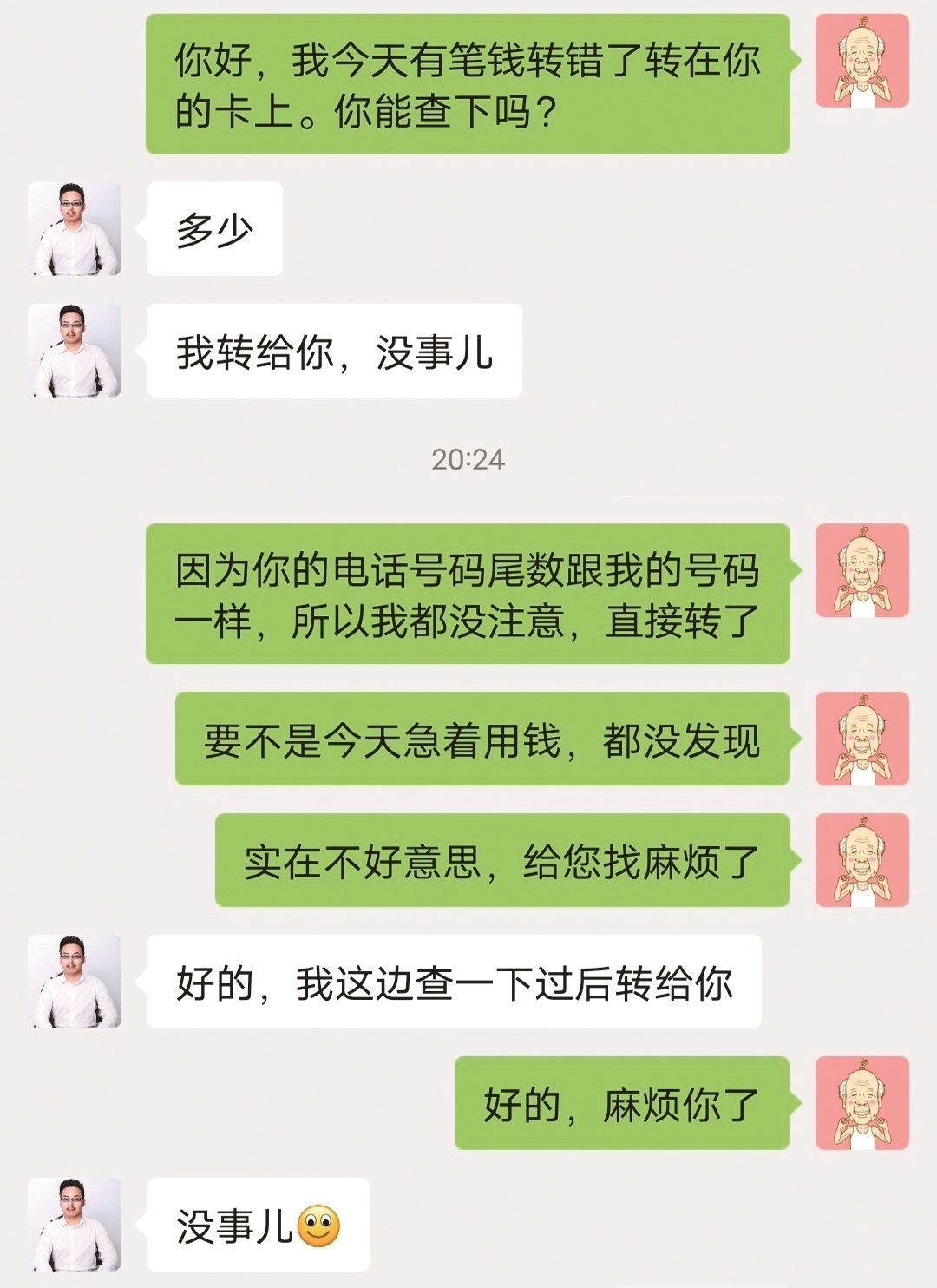 “你好,我有笔钱转错了,到你的卡上,你能查一下吗?”2月19日晚8时22分,张涛发出消息不久,就收到了对方回复:“多少?我转给你,没事儿。”张涛将两次转账的截图发过去,23分钟后,对方将两笔钱共计7000元通过微信转给了他。