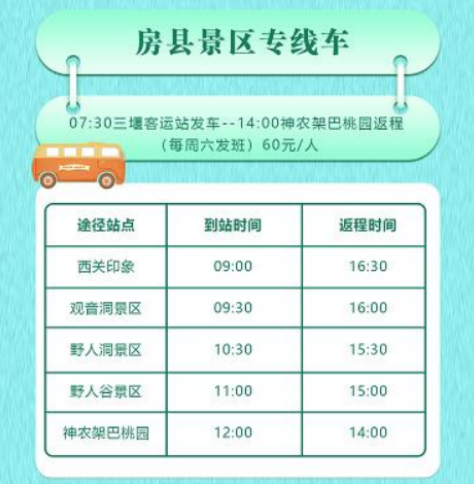 据悉,十堰至房县景区专线将在每周六早上7点30分从十堰市旅游集散中心(三堰客运站)发车,可到达我县西关印象、观音洞、野人洞、野人谷等景区,单人往返票价60元。本次旅游专线的开通,将极大的方便市民来房旅游,促进我县文化旅游产业的发展。