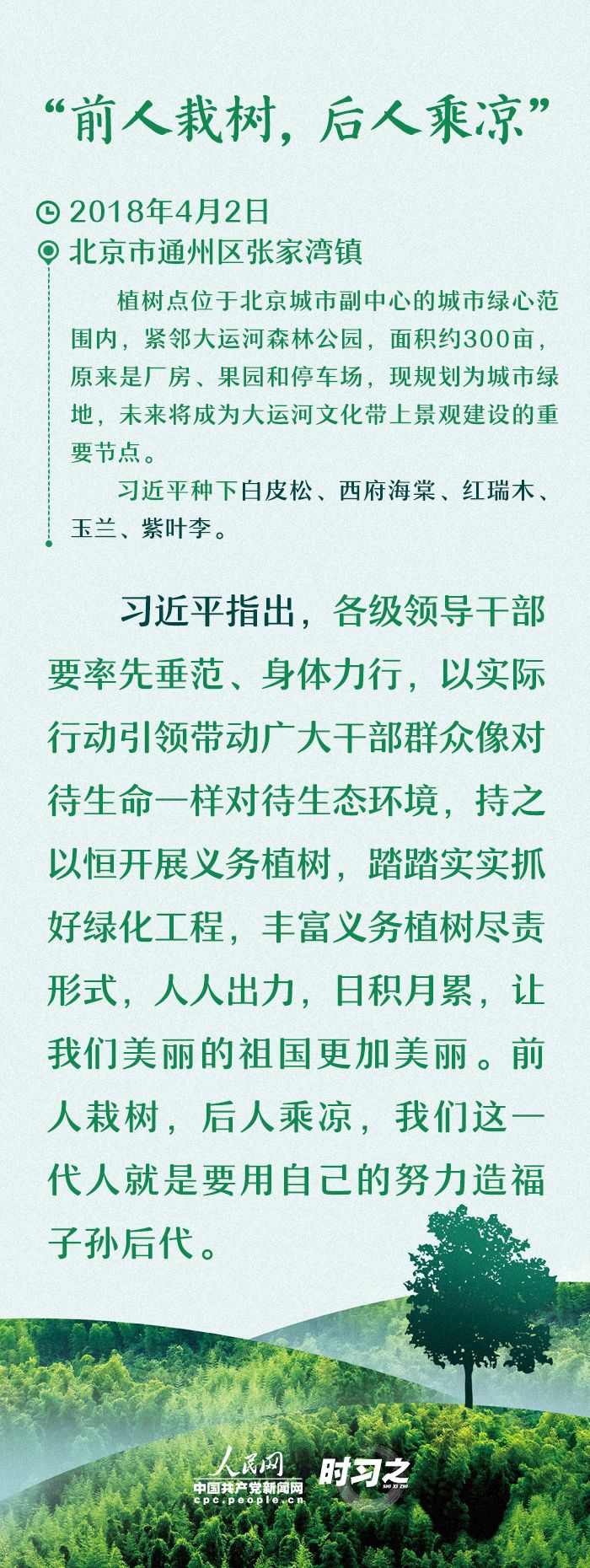 春风吐绿、草木初萌,又是一年植树节。“造林绿化是功在当代、利在千秋的事业” “前人栽树,后人乘凉”……党的十八大以来,习近平总书记每年都会参加义务植树活动,并多次谈到植树造林的重大意义。过去九年间,习近平总书记都在哪里植树?种了哪些树?每次植树都讲了些什么,一起来回顾。