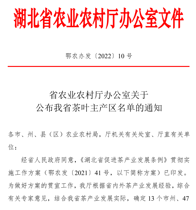 自2022年起,茶叶主产区认定每年实行动态管理,以当年《湖北农村统计年鉴》中“年末实有茶园面积”为准,省内茶叶种植面积达10000亩以上(含10000亩)的县级以上行政区就认定为“湖北省茶叶主产区”,不再另行发文。