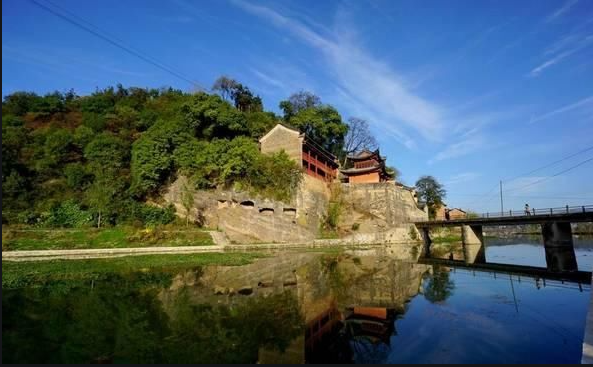 穿过古街向前走去,显圣殿映入眼帘,这也是在军店镇上诸多历史传说中唯一保存完好的古建筑。登高四望,湖光山色尽收眼底,山不高而秀雅,水不深而澄清,地不广而平坦,林不大而茂盛。松篁交翠,高岗崎岖,使人流连忘返,超然脱俗。