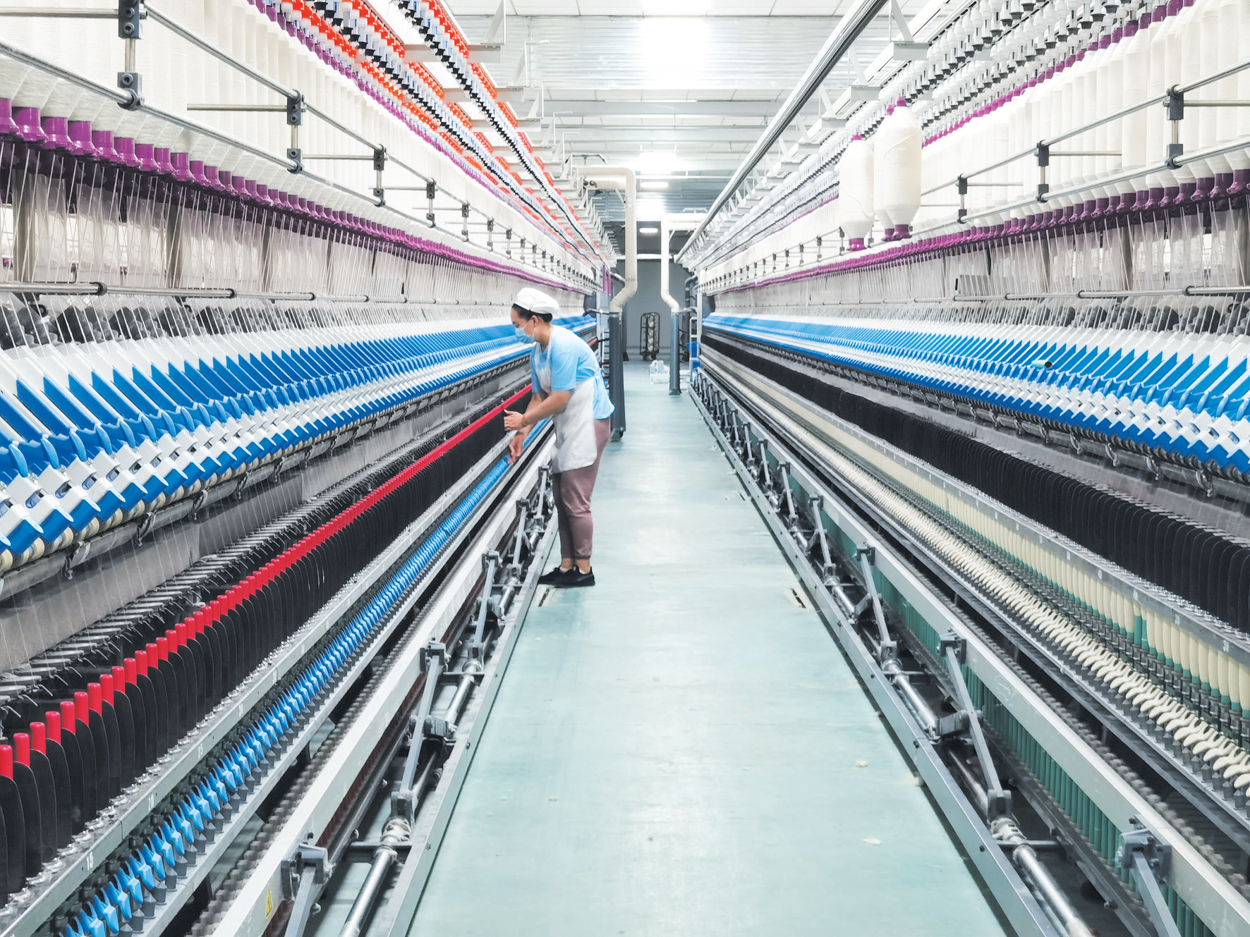 4月15日,房县恒达纺织有限责任公司崭新的纺纱生产车间里,工人在全自动机器前忙碌着(如图)。该公司的前身是房县国有棉纺厂。本世纪初,棉纺厂濒临破产,房县积极招商引进浙江诸暨客商赵扬飞投资100万元资金,经过20多年的经营发展,如今该公司已成为年产值10亿元的全县纺织产业龙头企业。