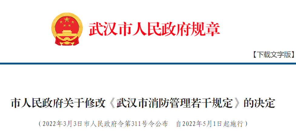 2022年3月3日,武汉市人民政府发布了新修订的《武汉市消防管理规定》(以下简称《规定》),《规定》将于5月1日起实施,其中提到:
