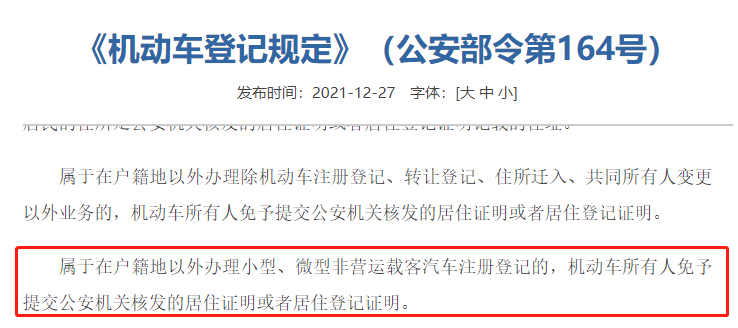 新规第八十九条中提到:办理小型、微型非营运载客汽车注册登记的,机动车所有人免予提交公安机关核发的居住证明或者居住登记证明。