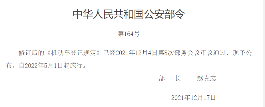 公安部在2021年12月发布的《机动车登记规定》(公安部令第164号),将于2022年5月1日起施行,主要有以下3大变化: