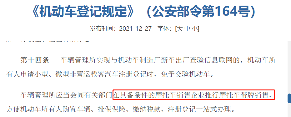 新规第十四条规定:车辆管理所应当会同有关部门在具备条件的摩托车销售企业推行摩托车带牌销售,方便机动车所有人购置车辆、投保保险、缴纳税款、注册登记一站式办理。