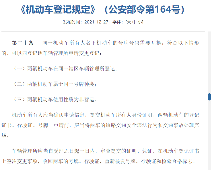 新规第20条规定,同一机动车所有人名下机动车的号码需要互换的,只需符合以下三个条件: