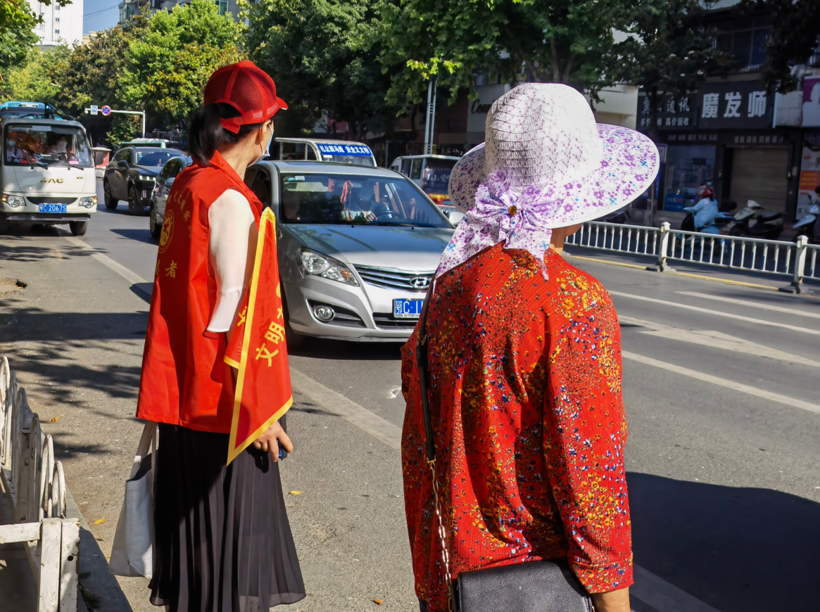“您好,现在是红灯,请等一会再过马路!”“您好!十字街正在施工,这里是临时过马路的路口,请您把车辆停到前方不影响视线的地方”……上午7点多,正值上班早高峰,4名头戴红色志愿帽、手持“文明在心平安畅行”小红旗的文明交通志愿者,在十字街至西河桥路段认真开展文明交通安全劝导工作。他们一边向车辆行人宣传“文明礼让”的交通法规,一边帮助交警维护交通秩序,成为街头一道靓丽的风景。
