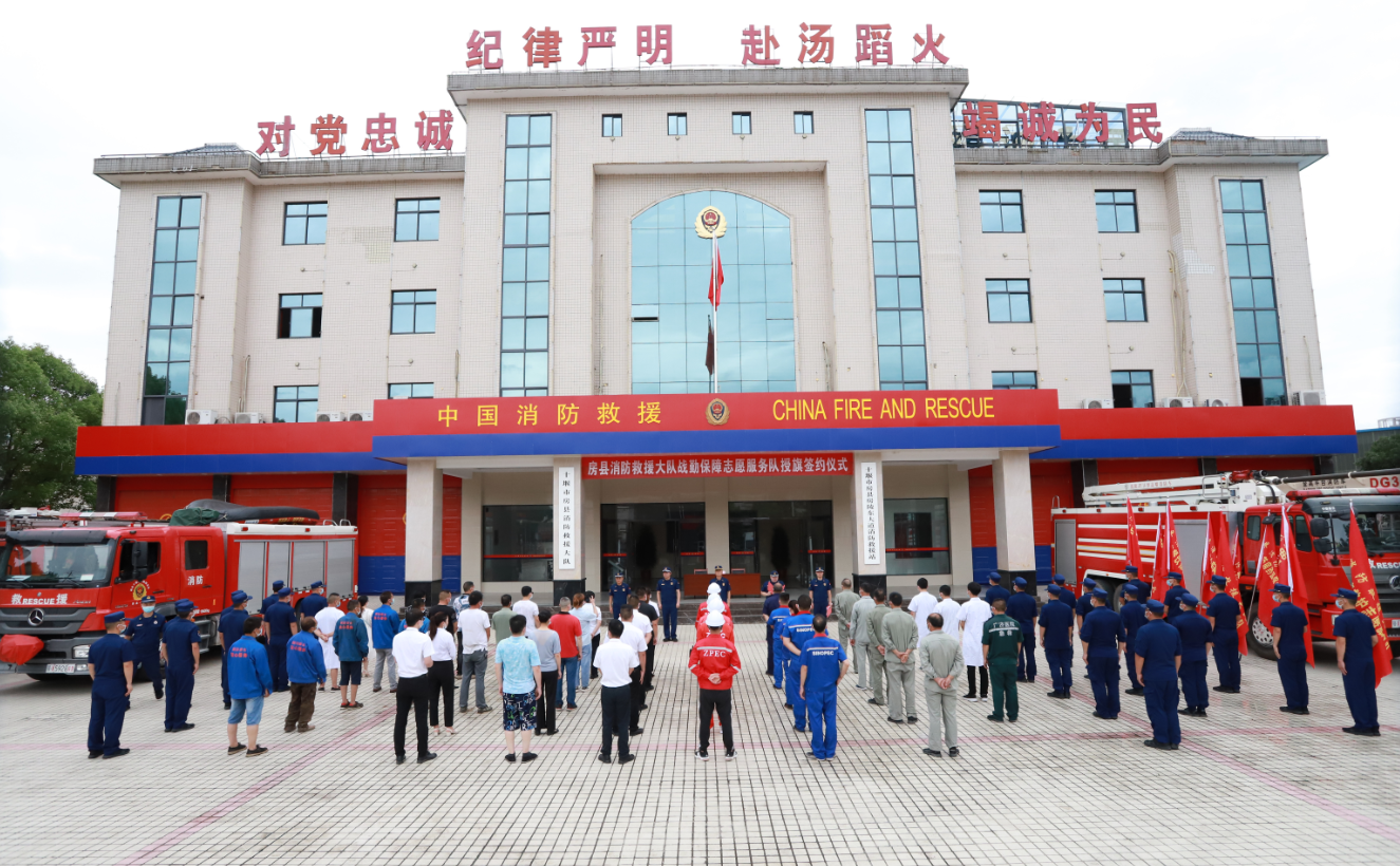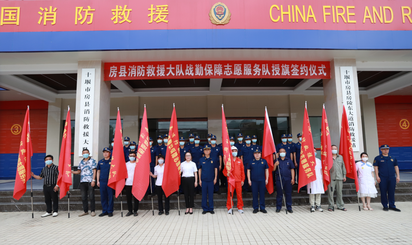 房县新闻网讯 通讯员 彭磊 卢勇 报道:6月23日上午,房县广济医院、同相燃气、供电公司、中百仓储等10家单位在房县消防救援大队举行战勤保障志愿服务队授旗签约仪式。