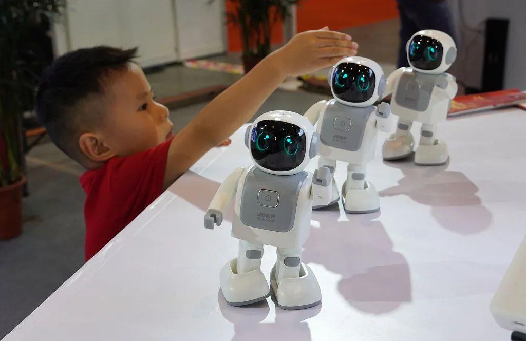 △2019年9月7日,首届中国-东盟人工智能峰会产品展在南宁国际会展中心拉开帷幕。一名儿童在5G体验区观看机器人跳舞。