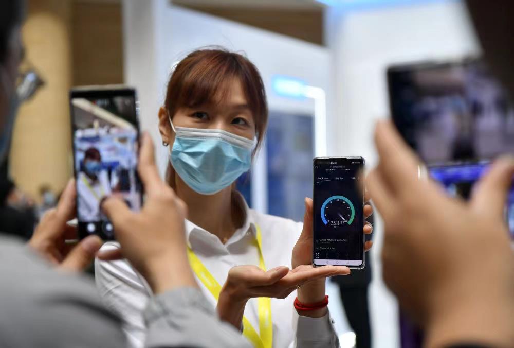 △2021年5月17日,在世界电信和信息社会日大会上,工作人员用手机展示5G网络速度。