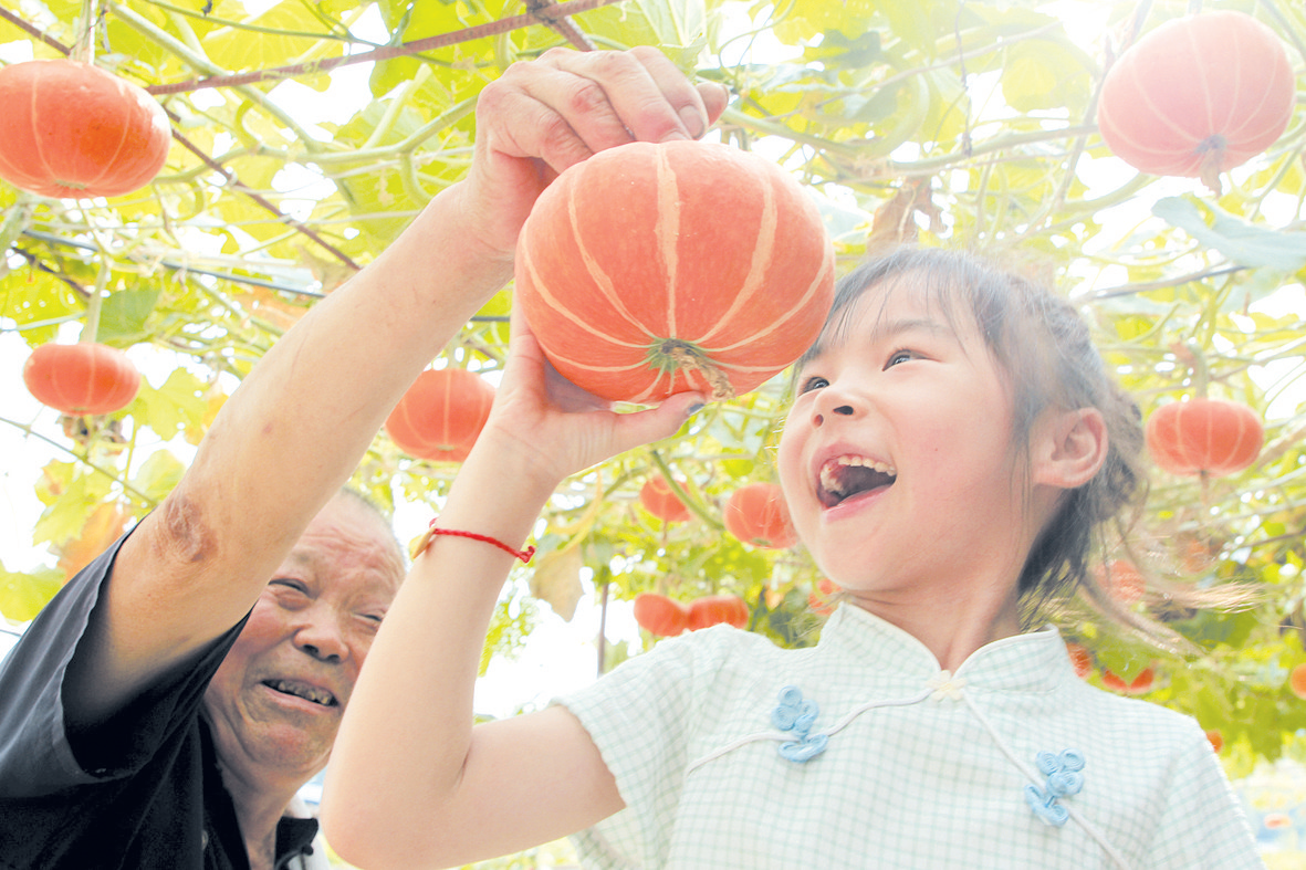 房县新闻网讯 特约记者 张启龙 报道:初秋时节,房县军店镇中村村农民种植的小磨盘南瓜成熟,引来游客观赏、采摘。小磨盘南瓜在当地俗称“金瓜”,成熟后呈橙黄色,不仅能食用,还具有观赏价值。当地村民利用自家庭院或房前屋后空地,采取棚架方式种植,既能创收,又为乡村增添了微景观。