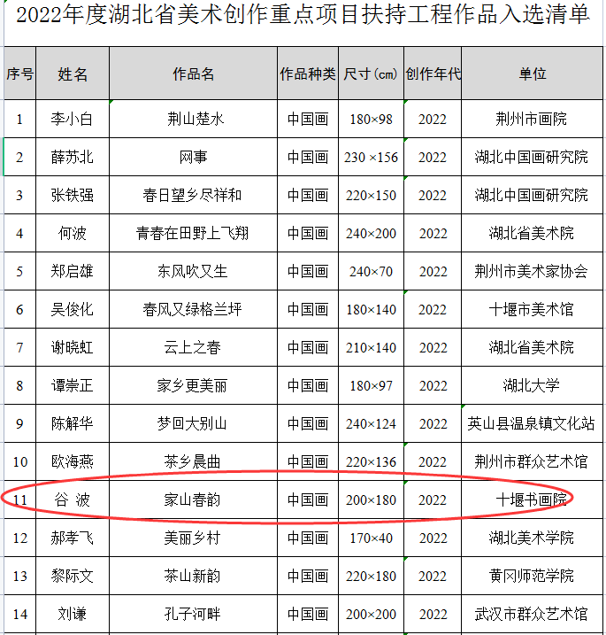 房县新闻网讯 通讯员 张立林 报道:近日,湖北省文化和旅游厅对2022年度湖北省美术创作重点项目扶持工程评审结果进行公示,房县美协谷波的国画《家山春韵》入选。