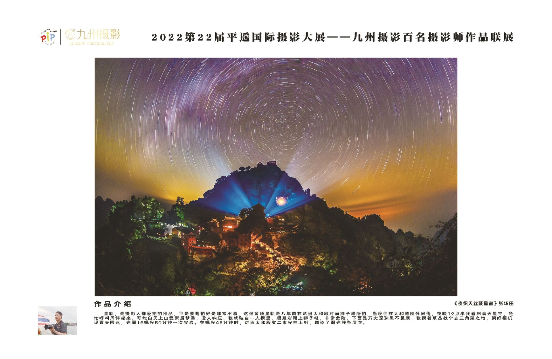 房县新闻网讯 通讯员 张立林 报道:9月19日,九州摄影百名摄影师联展——2022第22届平遥国际摄影大展盛大开幕,房县摄协顾问、中国摄协会员张华田的摄影作品《夜织天丝聚星宿》获“艺术观念类”作品组一等奖,并由九州摄影研究院收藏。