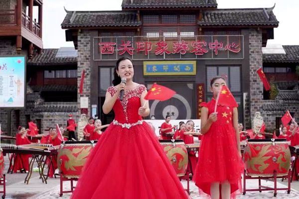 在西关印象周南广场,来自东城小学的学生在这里先后表演《中华孝道》《唐诗联唱》《精忠报国》《唱支山歌给党听》和《我和我的祖国》等文艺节目歌唱祖国,感谢伟大时代,共祝祖国繁荣昌盛。