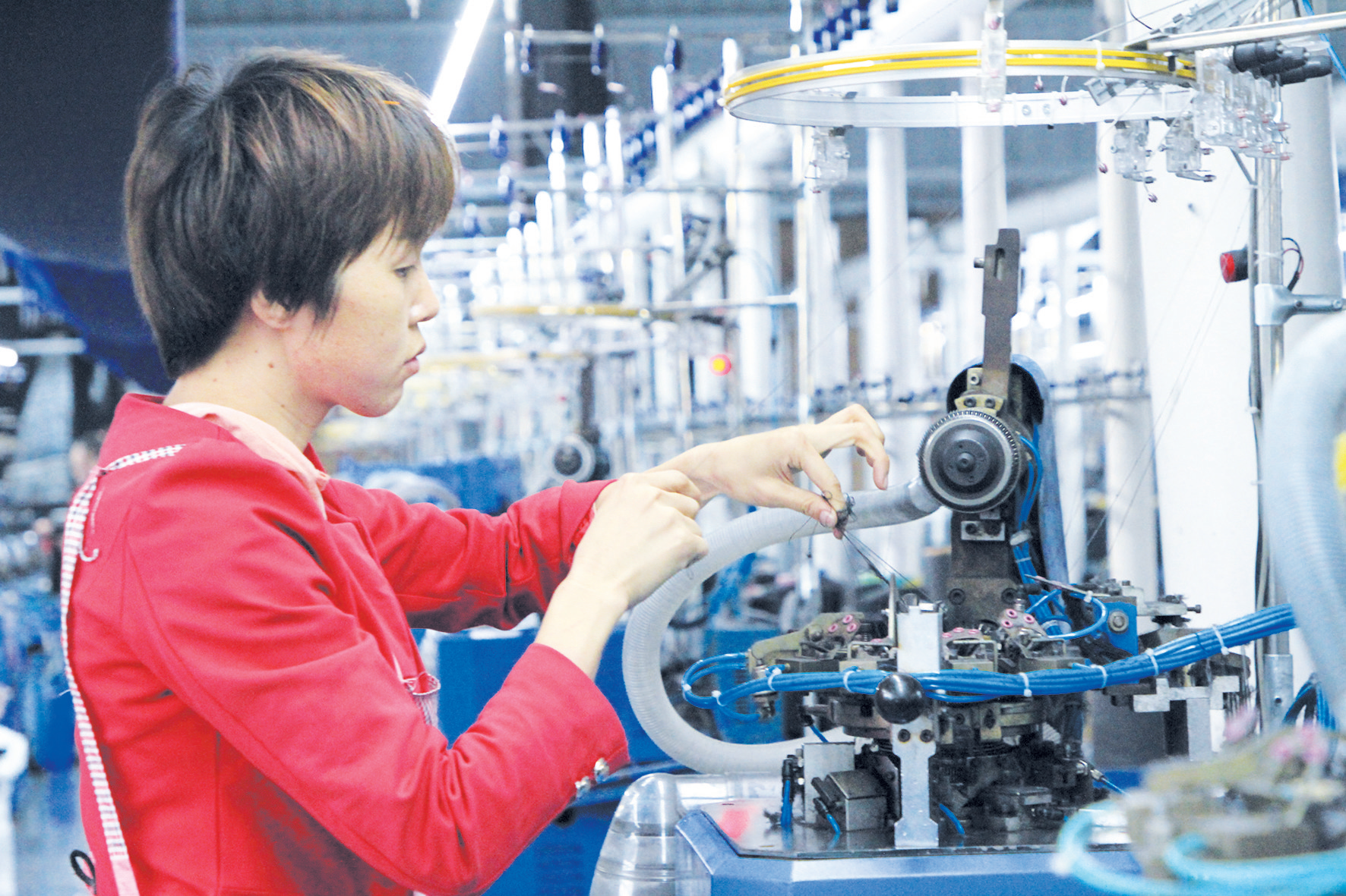 房县新闻网讯 特约记者 张启龙 通讯员 刘韩 摄 :近日,房县瑞泰针纺有限责任公司针纺车间内,工人抓紧时间赶制棉袜,这些产品将出口俄罗斯、哈萨克斯坦等国家。今年以来,该县多举措优化营商环境,全力为企业排忧解难,激发市场主体活力。目前,当地29家针纺企业加班加点赶制订单产品,生产的防护服、棉袜、棉服等畅销海外市场。