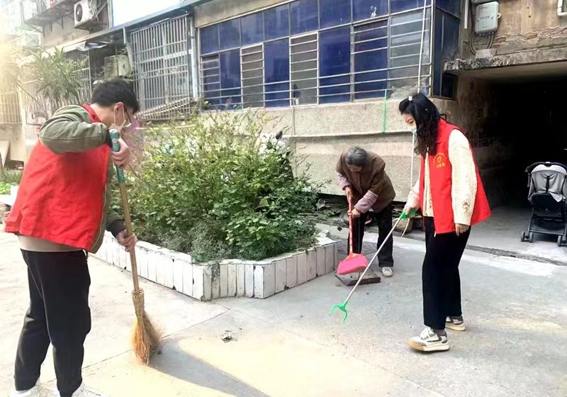 阿姨拿来自家的扫把、垃圾铲,开始忙活起来,一边清扫一边跟我们聊了起来。经过攀谈,我才知道,阿姨今年60多岁了,名叫胡妍瑾,就住在本小区2栋1楼,每次我们红马甲来打扫卫生,她都会在阳台上看着我们陷入深思......