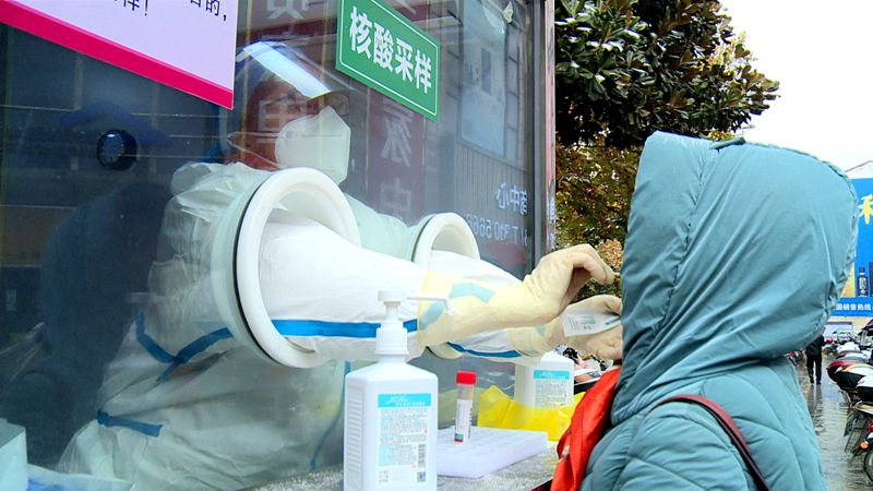 上午9点40分,室外温度零下1度,雪花漫天飞舞。采样岗亭的值守医生许明坚,已坚守岗位5天了。她的防护面罩上,雾气凝结成一滴滴水珠。她一丝不苟,一遍遍不停重复着动作,反复进行着试管贴签、消毒洗手、准备试剂管、采集咽拭子、现场采样……