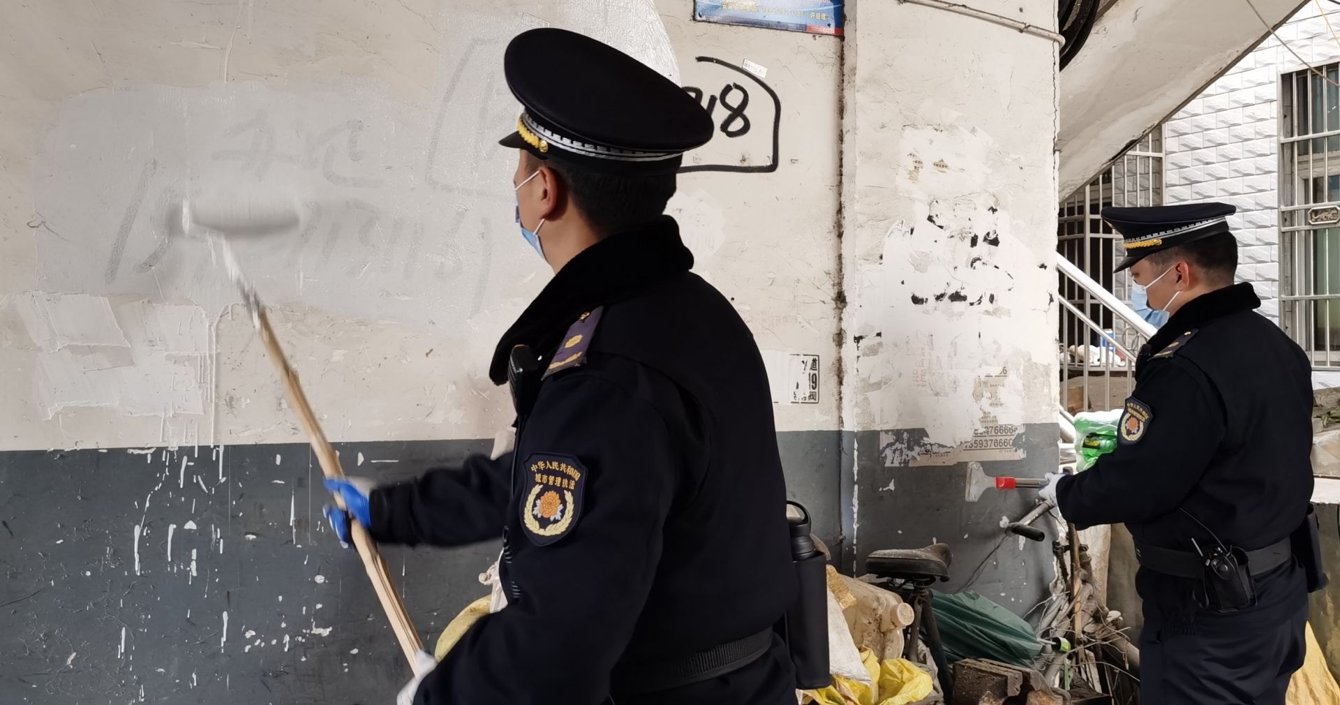 现场记者看到,多名张贴小广告当事人和执法人员一起手持涂料、刷子、小铲等工具到小区现场对小广告进行清理。