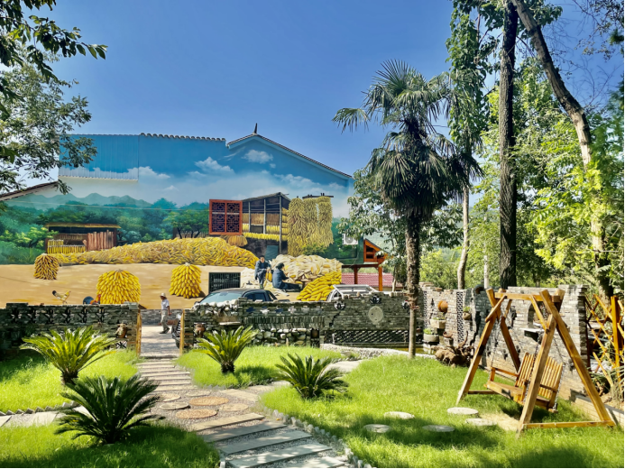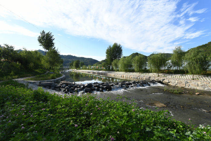 站在鸳鸯柏的院场里,向东望去,近处是青乎乎的长角矮辣椒,几十亩地的辣椒成垄成行,有些壮观;远处呢!有沿河栈道,有农耕田园,有树上餐厅,有座座色彩斑斓的小山坡。由东向西环视,山山相连,那些散落的村子里白墙黑瓦的房屋掩映在绿柳竹林之中,如一幅幅写意的山水画。我们看到艳阳下,片片白色的光伏发电板闪闪发光,许多工人师傅正在大田里焊接新的蔬菜大棚骨架。走不多远,一个鱼塘惹人注目,鱼塘周围有木制栈道,可供游人游玩和垂钓,鱼塘里,不时有金鱼和草鱼来去游弋。路边的菜园子里,青绿的葱蒜,白菜、冬萝卜和菠菜,生机盎然。一个朋友发现园子边上长着肥嫩的腊菜和地米菜,也不怕露水,挽起袖子就忙乎起来,不一会儿,就拾掇了一小口袋新鲜的野菜,看着带着露水的嫩野菜,我们都称赞不已。寻一处洗手,发现岔路边有一间古色古香的仿古木制结构的房屋,门锁紧闭。匾上曰:上书房。从格子窗望进去,里面摆放着几架书籍。这实际上就是一间充满乡土气息的农家书屋,叫“上书房”,我心中暗想:这是不是显得有些高大上的虚空之感呢?!我们在“上书房”外徘徊许久,正闲谈着,朋友的一个表亲开着电动三轮车赶过来,热情地招呼我们到她家去做客。我们怕麻烦,同时又知道她在一个蔬菜大棚老板那里打工,中午是要给许多工人做饭吃的,就婉言谢绝了她的好意。她有些歉意,赶忙跑到一个小商店里给朋友的女孩子买来一大包零食吃。她又热情当向导带我们沿河游玩起来。