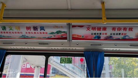 公交车厢内“社会主义核心价值观”“创建文明城市 实现安居乐业”“讲文明树新风”“文明出行”“关爱保护未成年人”等创文公益广告,不仅装点着城市文明,也散发出道德芳香。在向市民传递向上、向善正能量的同时,也于无声无息间,把文明新风融入市民日常生活,让道德理念走进百姓心灵。