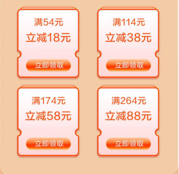 每轮共设置四种88元(单笔消费满264元可用)、58元(单笔消费满174元可用)、38元(单笔消费满114元可用)、18元(单笔消费满54元可用)四种面额。
