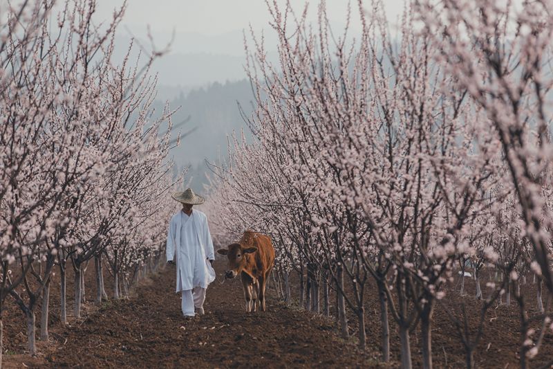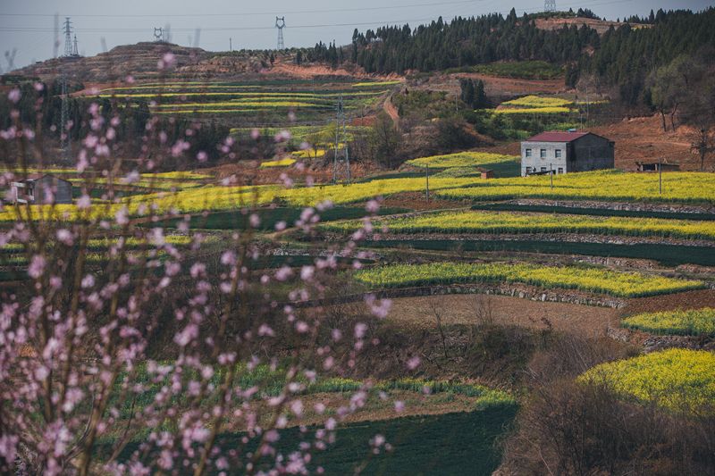 河岸步道如画,岸上是千亩谢蕊吐绿的杏林。杏花如云,菜花流金,桃红柳绿,放眼远眺,阶梯次第成画,恍惚间,犹如步入陶渊明笔下的桃花源。