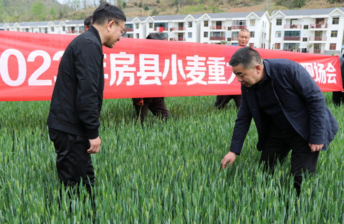 连日来,在房县2023年小麦重大病虫防控现场会现场,装有杀菌剂、杀虫剂、植物生长调节剂等混合药液的无人机来回喷洒,为小麦健康生长保驾护航。