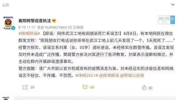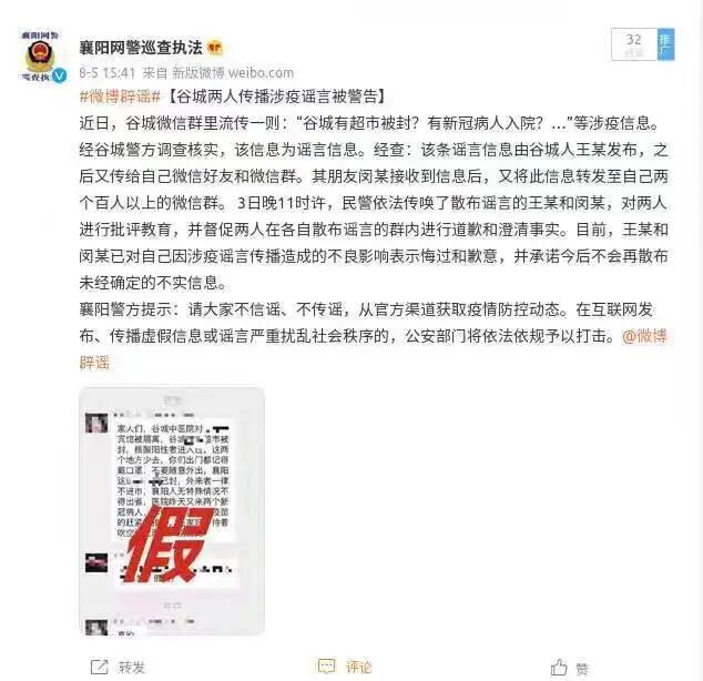 同时,网信、公安等部门联合办理谣言案件216起,对制造散播“谷城一超市因疫情原因被封”“南漳县全民做核酸”“樊城一女子称武汉工地有因感染死亡”等虚假信息人员予以处罚,并责令删除网上言论,行政拘留6人、行政警告2人、行政罚款1人、训诫9人、批评204人,组织网评员转发相关辟谣信息7000余条,形成网上网下协同辟谣的良性工作机制,收到了良好法律效应和社会效应。