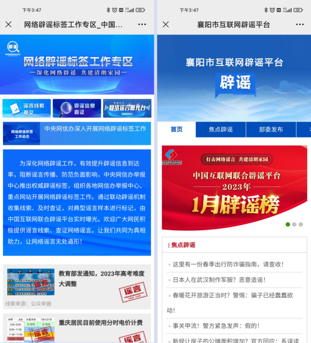 襄阳市互联网辟谣平台自建立以来,针对“新冠肺炎防控”“医保改革”、ChatGPT等重点时事热点和民生事项发布辟谣信息80条、政策解读信息15条,利用媒体资源组织记者“跑线”采写发布深度报道25条,收纳相关法律法规13部,有效遏制了谣言信息在网络空间蔓延传播。