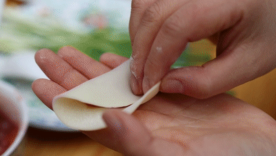 再用饺子皮包裹樱桃酱,对折后用葱丝打结固定。