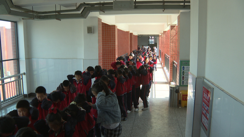 此次演练模拟突发强震,部分墙体出现裂缝,部分门窗变形,有大量尘土坠落为背景。随着地震警报响起,学生迅速躲在课桌下避险,借助书包、书本保护头部和身体。楼体晃动结束后,在教师和消防队员组织下,各班学生迅速疏散到操场躲避余震。在教学楼四楼演练现场,模拟两名学生被困且受伤,消防队员第一时间开展救援行动,运用滑轮和绳索成功将学生运送到一楼安全位置,由医护人员送往医院救治。