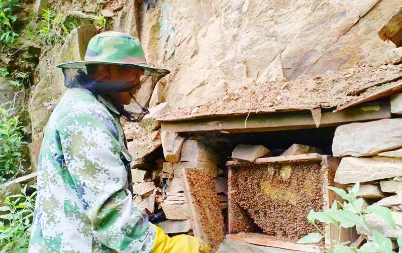 朱家坪村海拔800多米,这里山高谷深,花草树木繁多,是养殖蜜蜂的理想之地。村民们一直有着传统养蜂习惯,村干部建议朱本剑也养殖蜜蜂,无一技之长的他尝试性在房屋周围养了四箱,初次尝到了甜头,也看到了希望,有了扩大养蜂规模的想法。