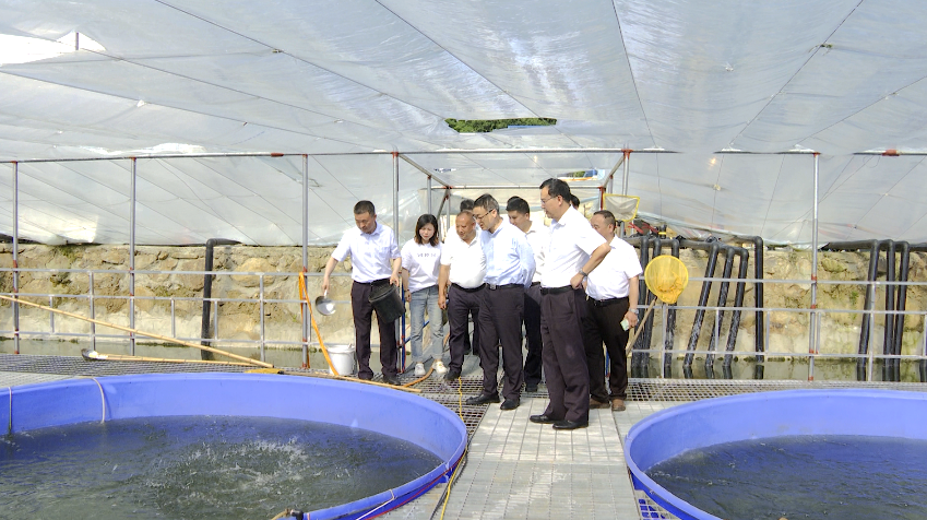 黄国雄一行来到青峰镇阳坪村设施渔业基地,实地察看设施渔业发展模式,听取养殖基地的项目建设情况汇报,就模式成本、效益与技术要求等情况,和基地技术人员进行了深入交流。